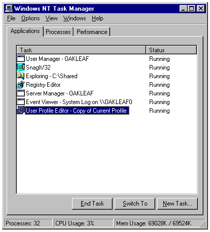 The Applications page of Windows NT Server 4.0's improved Task Manager.