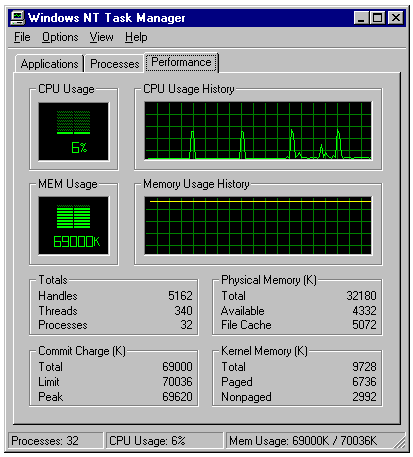 The Windows NT 4.0 Task Manager provides a substantial extension to the Task Manager tool of Windows NT 3.x. To open Task Manager, right-click the taskbar and choose Task Manager from the popup menu. The Task Manager window includes the following tabbed pages: