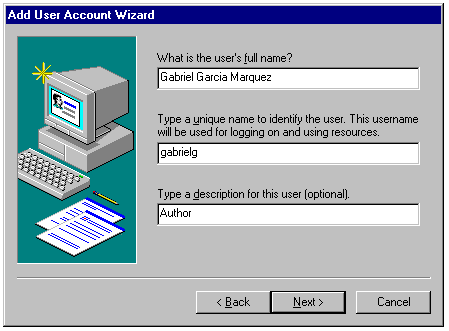 The second step in adding a new user account with the Add User Account Wizard.