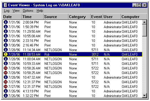 Displaying server system events remotely with the Windows 95 version of Event Viewer.