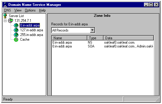 Displaying addresses for a DNS server in the Domain Name Service Manager.
