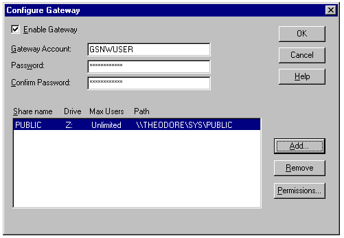 Windows NT 4.0's Client for NetWare and Gateway Services for NetWare (GSNW) now support NetWare Directory Services (NDS), enabling browsing of NDS resources (using NetWare 3.1x bindery emulation mode), NDS authentication, and NDS printing. (Gateway Services for NetWare allows a Windows NT 4.0 server to process dial-in connections to resources located on NetWare servers.) Figure 1.12 illustrates GSNW's Configure Gateway dialog with a NetWare share added. Windows NT Server 4.0 also supports authentication to multiple NDS trees and can process NetWare logon scripts.