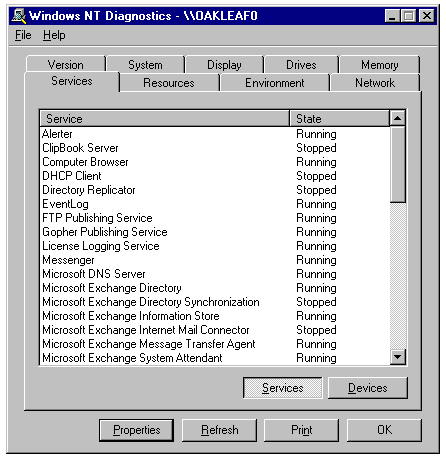 The Services page of the Windows NT Diagnostics tool.