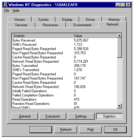 Networking statistics displayed by the Network page of the Windows NT Diagnostics tool.