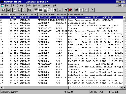 After you install the Network Monitor tools and Agent Service from Control Panel's Network tool, you click the toolbar's Start Capture button (with the VCR play symbol) to begin the logging process. Then click the Stop Capture and View button (with the VCR stop symbol and glasses) when you've captured the desired number of frames. During the capture process, the bar graphs display network activity. The Capture Summary pane takes over Network Monitor's window, as shown in figure 1.16.