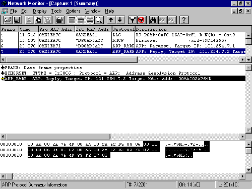 Double-clicking an entry in the Capture Summary pane displays the two additional panes (see fig. 1.17). The middle Capture Detail pane displays the frame data by OSI component layers. The bottom Capture Hex pane displays a hex and ASCII dump of the content of the selected frame.