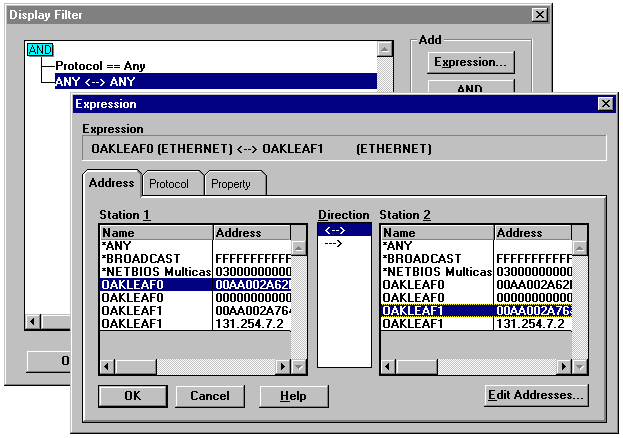 You can apply Network Monitor's Display Filter by clicking the Edit Display Filter toolbar button (with the funnel symbol) to display the Display Filter dialog, shown in figure 1.18. You can use Boolean logic to create a custom filter with the AND, OR, and NOT buttons. Creating custom filters is useful in isolating network problems, such as cross-router traffic, that degrade overall network performance.