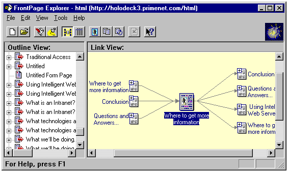 The Outline View and Link View panes of the FrontPage Explorer application.