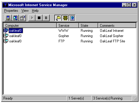 Internet Information Server 2.0 includes the Internet Service Manager for setup and maintenance of World Wide Web (WWW), Gopher, and FTP sites, which the Windows NT Server 4.0 Setup program installs by default in separate subfolders-\inetsvr\wwwroot, \inetsvr\gophroot, and \inetsvr\ftproot, respectively. Figure 1.25 shows the opening window of Internet Service Manger with the Web, Gopher, and FTP services installed and running.