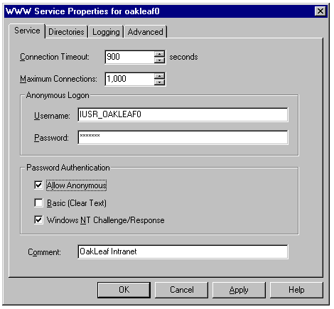 Double-clicking an item in the Computer column displays the Service Properties for ServerName sheet for the service. The default Service page allows you to specify the connection timeout, maximum number of simultaneous connections, and anonymous logon and/or password authentication for the default Internet Guest account, IUSR_SERVERNAME (see fig. 1.26). User Manager for Domains allows you to alter user group membership for this account; the default user groups for the Internet Guest account are Domain User and Guest.