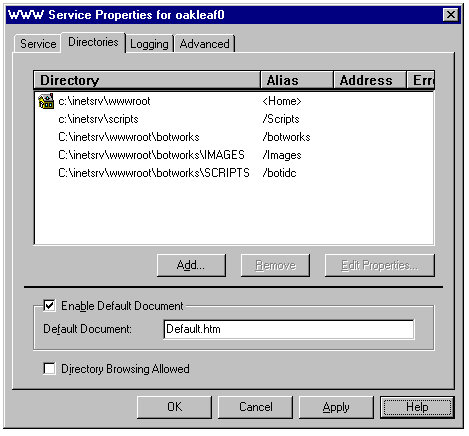 Displaying the Web-related folders page of the WWW Service Properties sheet of Internet Service Manager.