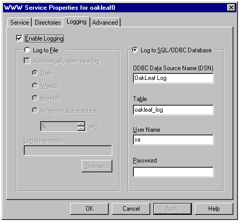 In addition to the Service page, Internet Service Manager's Service Properties sheet includes Directories, Logging, and Advanced pages. (Microsoft hasn't replaced directory with folder in all instances.) The Directories page displays Web-related subfolders of the \inetsvr folder, including Web-style share names, such as /Scripts, in the Alias column (see fig. 1.27). The Logging page allows you to log user statistics to a text file or to a SQL Server 6.x database (see fig. 1.28) or any other ODBC-compliant RDBMS. Before specifying the logging database in the Logging page, you need to create the ODBC database and add a System data source for the database with Control Panel's ODBC tool. The Advanced page allows you to specify TCP/IP clients to be excluded from intranet access; alternatively, you can specify the TCP/IP address of each client with intranet access.