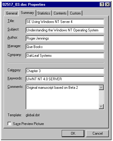 Files created by today's 32-bit Windows applications, such as Microsoft Word 7.0, let you add property values as attributes of documents (see fig. 3.2). The objective is to enable searching not only by file name, but on property values and indexed file content. The plan was to use OLE DB (an OLE Automation database interface) and OLE DS (OLE directory services) to query and manipulate the repository entries. The Windows 95 UI also was scheduled for the Cairo release, originally planned for release in early 1996.