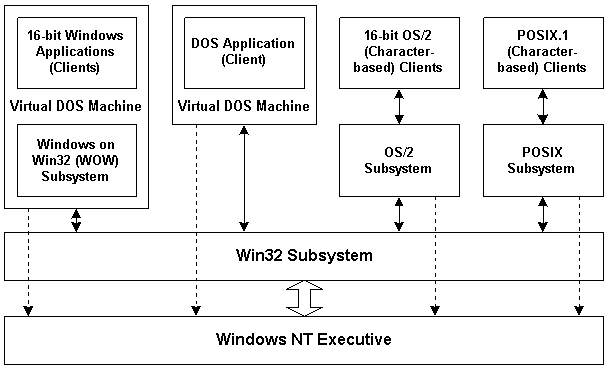 Virtual DOS machines (VDMs) provide a protected environment for individual 16-bit DOS applications. The Win32 subsystem provides a character-based window (called a console) for interaction with the user. One VDM is created for each instance of a DOS application. Windows on Win32 (WOW) runs all 16-bit Windows 3.1+ applications in a single instance of a VDM with common protected memory. Thus, if one unruly Windows 3.1+ application crashes the VDM, all other running 16-bit Windows applications crash with it. Each 16-bit Windows application is assigned its own thread of execution to provide multitasking capability. The OS/2 subsystem runs character-based OS/2 applications in a console. The paucity of character-based OS/2 applications that don't have Windows NT equivalents means that system and network administrators seldom need be concerned with using the OS/2 subsystem. The POSIX.1 subsystem can run POSIX-compliant applications, which is required for government purchase of "open systems." Windows NT survived a recent appeal by UNIX bidders of an award of a Coast Guard workstation contract to Unisys that proposed to use Windows NT as the operating system. Microsoft's funding of development of the POSIX.2 shell and utilities of OpenNT, mentioned earlier in this chapter, is related to one of the Coast Guard contract requirements. It's likely that Cairo will substitute POSIX.2 for the POSIX.1 subsystem.