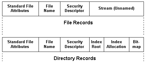 The simplified structure of the file and directory records of the Master File Table for an NTFS volume.