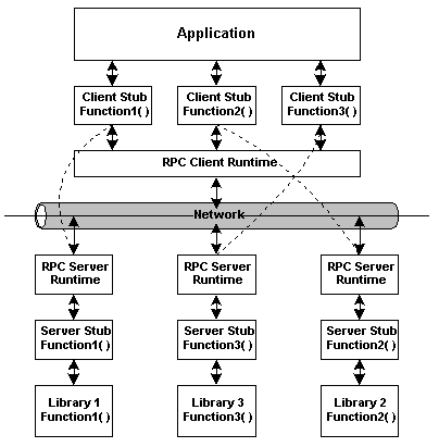 Application is the program that calls library functions. Data sent to and returned by the function are implemented as function call arguments, as in RenderFrame(DrawingOut, FrameIn). RenderFrame is the name of the function, DrawingOut is an output parameter, and FrameIn is an input parameter. Client function stubs have parameters that correspond to the function call arguments. The client stubs marshal the parameter values over the network; marshaling processes the parameter values for transmission over the network. Client function stubs take the place of the corresponding functions that ordinarily would be contained in local DLLs. RPC client runtime is responsible for determining the network location of the called function and the transport protocol required, and connects to the appropriate network driver of the I/O manager. RPC server runtime receives RPCs and directs each call to the appropriate server function stub. Both the server and client runtime use Windows NT's transport provider interface (TPI) to communicate with the network driver. Server function stubs unmarshal the function parameters and call the corresponding functions of the local DLL(s). Library function contains the code that does the work. Remote DLLs are identical to local versions.