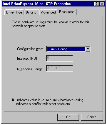 If the PC has a network card, you can use Control Panel's Network tool or Windows Setup to display the current IRQ and I/O address range settings for your network card. Figure 6.1 shows the Resources page of the property sheet for an Intel EtherExpress 16/16TP network card. Click the Advanced tab to display additional settings for the network adapter. Windows 3.1+'s Network Setup dialog leads to dialogs that display similar information.