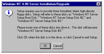 The Windows NT Server 4.0 distribution CD-ROM is bootable, but relatively few CD-ROM drives and/or system BIOSes support bootable CD-ROMs. To install Windows NT Server 4.0 on most PCs with a supported CD-ROM but no operating system installed, you must use Setup boot disks to install a minimal version of Windows NT on the PC. If you have the distribution CD-ROM but no boot disks, have three formatted, blank 3 1/2-inch diskettes ready and follow these steps to create the required boot disks: