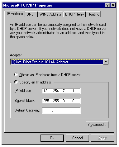 Each network protocol is configured separately. Figure 6.7 shows the configuration dialog for TCP/IP, the Microsoft TCP/IP Properties sheet.