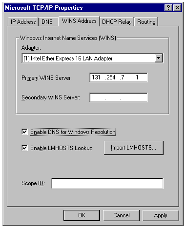 The WINS Address page of the Microsoft TCP/IP Properties sheet.