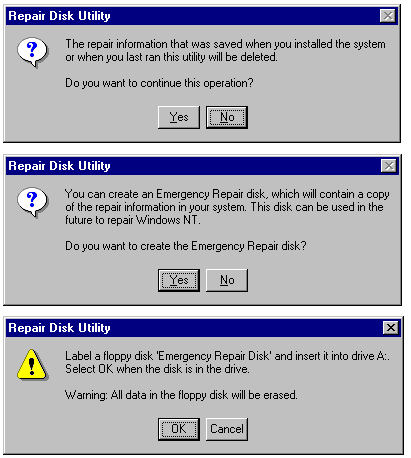 Be sure to update your emergency repair diskette frequently to keep the configuration data up-to-date. Your server's configuration is likely to change appreciably during the first few hours of use as you install applications, change users, and groups, and so on. The pace of change slackens with time, but you should make a habit of updating your emergency repair disk regularly. To create an updated emergency repair disk, follow these steps: