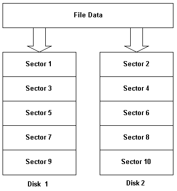 A diagram of RAID 0 (Sector Striping) with two drives.