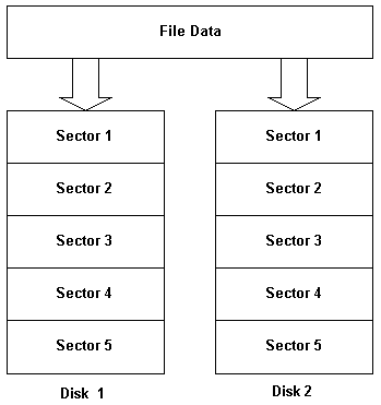 A diagram of RAID 1 (mirroring or duplexing) with two drives.