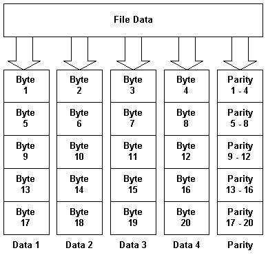 The fourth drive isn't used directly to store user data. Instead, the fourth drive stores the results of parity calculations performed on the data written to the first three drives. This small chunk striping provides good performance on large amounts of data, because all three data drives operate in parallel. The fourth, or parity, drive provides the redundancy to ensure that the loss of any one drive doesn't cause the array to lose data.