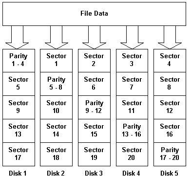 A diagram of RAID 5 (sector striping with distributed parity) with five drives.