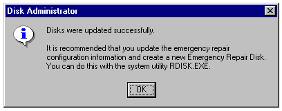 If another message box appears, to inform you that you must restart the computer for the changes to take effect, click OK to begin system shutdown. After Windows NT Server is restarted, again log on as an administrator and run Disk Administrator. The need to shut down and restart Windows NT depends on the status of the selected disk regions before the beginning of this process.