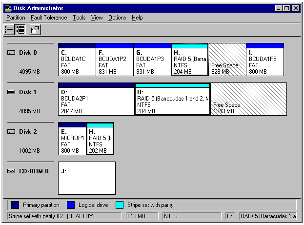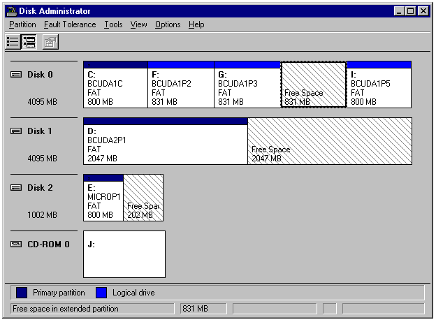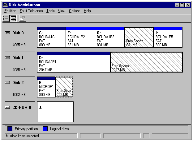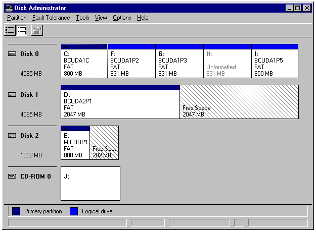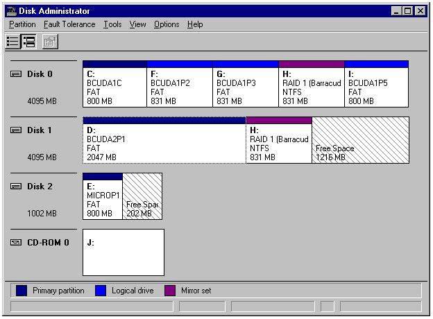 The computer used in the following example is OAKLEAF3, a 133MHz Pentium server that dual boots Windows 95 for digital video editing and Windows NT Server 4.0 for network test purposes. OAKLEAF3 is equipped with two Seagate ST15150W 4.3G Barracuda Wide SCSI drives (Bcuda1, Disk 0, and Bcuda2, Disk 1); a 1G Micropolis narrow SCSI drive (Microp1, Disk 2); and a Toshiba 4X SCSI CD-ROM drive connected to an Adaptec AHA-2940UW host controller. Bcuda1 has five 800K FAT partitions (Bcuda1p1 through Bcuda1p5), and Bcuda2 has two 4G FAT partitions (Bcuda2p1 and Bcuda2p2). Microp1 is divided into 800K (Microp1p1) and 200K (Microp1p2) partitions. The Bcuda1p4, Bcuda2p2, and Microp1p2 partitions were deleted (converted to free space) before performing the steps described in the following sections.