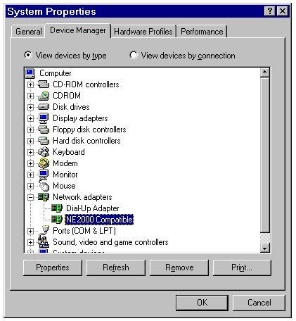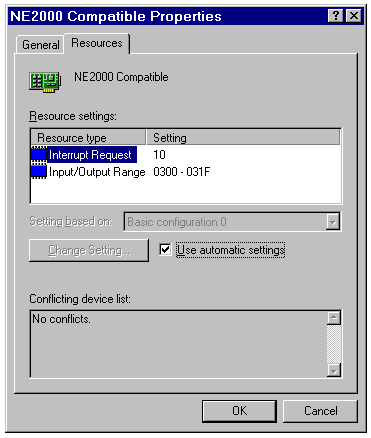 The network adapter resources page for an NE2000-compatible NIC.
