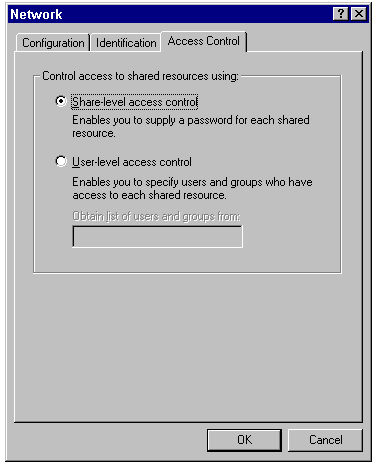 When you select User-Level Access Control, the Obtain List of Users and Groups From text box is enabled. If you're using file and printer sharing for Microsoft networks, enter the name of a Windows NT domain or an individual Windows NT server here. If you're using file and printer sharing for NetWare Networks, enter the name of a NetWare 3.1x server, or the name of a NetWare 4.x server running in bindery emulation mode.