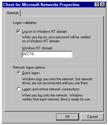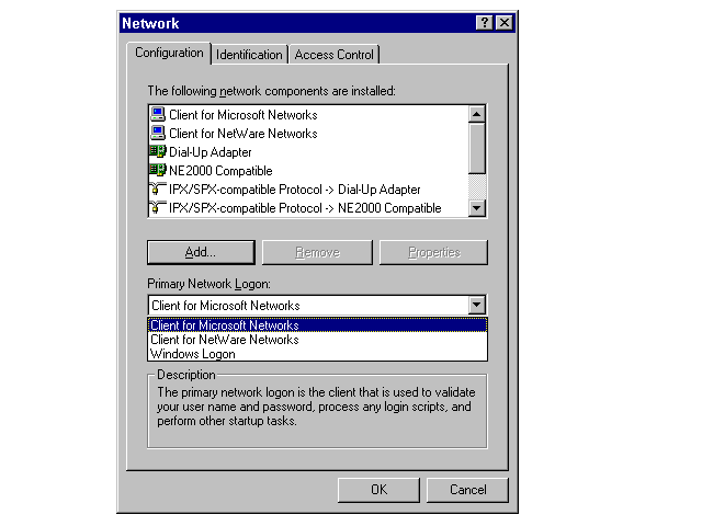 The Primary Network Logon determines which client software handles startup functions, such as user authentication and running logon scripts. By default, Windows 95 sets the Client for Microsoft Networks as the Primary Network Logon. You can set one of the other installed network clients as your Primary Network Logon if you prefer your startup functions to be performed by that client. You also can select Windows Logon as your Primary Network Logon, if you prefer not to connect automatically to the network each time you start Windows 95.
