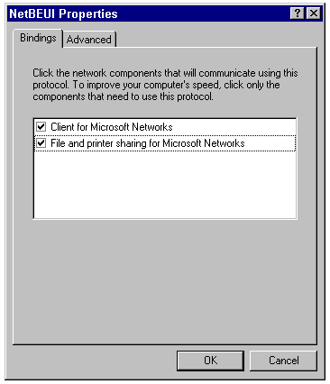 The Bindings page of the NetBEUI Properties sheet.