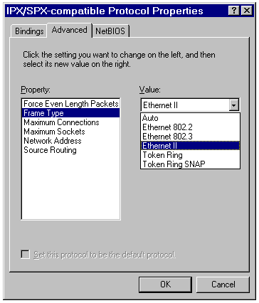 The Windows 95 IPX/SPX protocol defaults to frame type Auto, which usually succeeds in detecting the frame type being used by the NetWare server. If auto detection fails, you must explicitly set the frame type in the Advanced page of the IPX/SPX-Compatible Protocol Properties sheet. You can set the frame type to the following values: Auto, Ethernet 802.2, Ethernet 802.3, Ethernet II, Token Ring, or Token Ring SNAP.