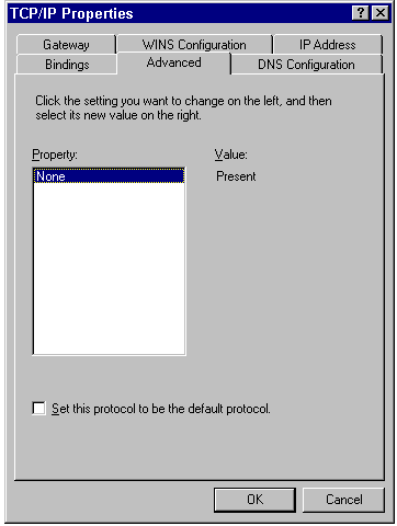 Selecting the Set This Protocol to Be the Default Protocol check box causes Windows 95 to use TCP/IP transport as the default. Most installations that support TCP/IP use TCP/IP as the default protocol.