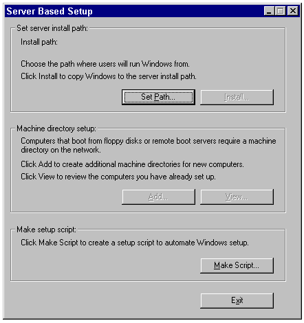 After the files are installed to the network server, you're returned to the Server Based Setup dialog. The next step is to create any needed machine directories. Although only a small subset of the Windows 95 files are specific to a particular client, these files are too large to fit on a floppy disk. If a particular client boots from a floppy drive, or is diskless and uses Remote Initial Program Load (RIPL), that client's files can be stored in a specific machine directory on the server. Files stored in a machine directory are specific to an individual client configuration. To install a machine directory, proceed as follows: