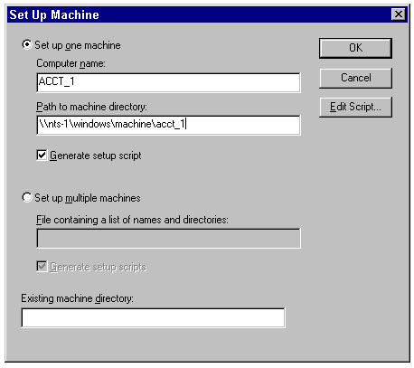 In the Set Up Machine dialog, select Set Up One Machine to create a machine directory for a single client (see fig. 10.34). Type the name of the client in the Computer Name text box.