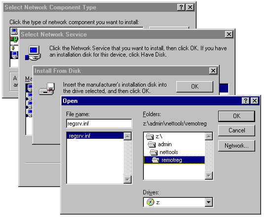 Installing Microsoft Remote Registry service from the Windows 95 CD-ROM.