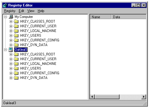 Registry Editor displaying the Registry keys of the local (OAKLEAF1, My Computer) and a remote (OAKLEAF3) Windows 95 computer.
