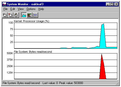 Monitoring processor usage and file system bytes read of a remote Windows 95 computer (OAKLEAF3).