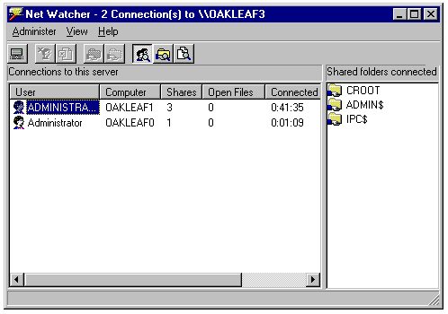 Net Watcher lets you monitor and control shared resources on the network. By using Net Watcher, you can add and delete shared resources on remote clients, display shared resources and connected users, close files left open by users, and disconnect users. Using Net Watcher to control remote clients requires that the remote clients have File and Print Sharing enabled. With File and Print Sharing enabled, a client can share resources with other clients on the network, and is referred to as a peer-to-peer server, peer server, or simply a server.
