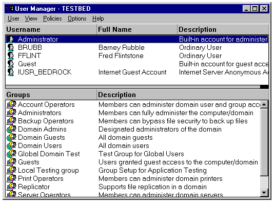 Windows NT Server 4.0 qualifies as an advanced NOS because it not only provides file directory and print services to its users, but also functions as an application server for Microsoft BackOffice and other server-based applications that run as services on Windows NT. The advanced security features of Windows NT Server have the potential to make network administration a very complex and demanding occupation. Fortunately, Microsoft provides a powerful and flexible tool, User Manager for Domains, for managing the users of a Windows NT Server network. User Manager for Domains lets network administrators create and manage individual user accounts and user groups, and manage the security policies that affect the user accounts and groups.