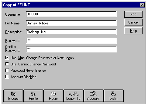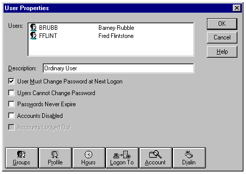 These property buttons allow the account administrator to specify additional properties for a user account. The buttons that control these properties are Groups, Profile, Hours, Logon To, Account, and Dialin. The dialogs that appear when you click each button are described in the following sections.