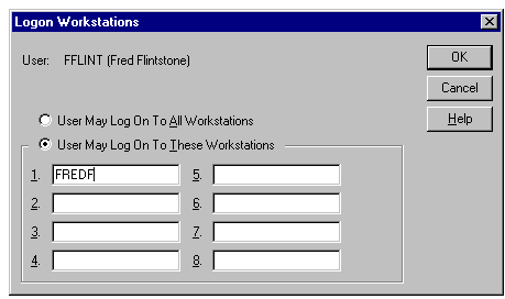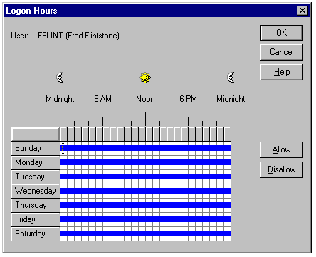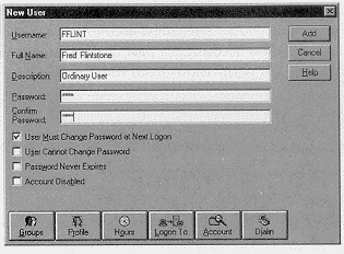 When adding a new user, a set of five buttons appears at the bottom of the New User dialog (refer to fig. 12.6). These buttons allow the account administrator to specify additional properties for a user account. The buttons that control these properties are Groups, Profile, Hours, Logon To, Account, and Dialin. These properties are explained later in the "Managing User Account Properties" section.