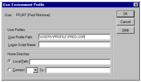 The user profile is specified in the User Profile Path text box, which contains the location of a user profile located on a Windows NT server. If the text box is empty, the profile is stored locally on each machine that the user logs on to.