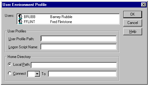 To further define a user's profile, the Profile button lets you select custom settings for one or more users. Clicking the Profile button displays the User Environment Profile dialog, shown in figure 12.12.