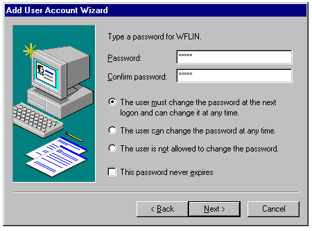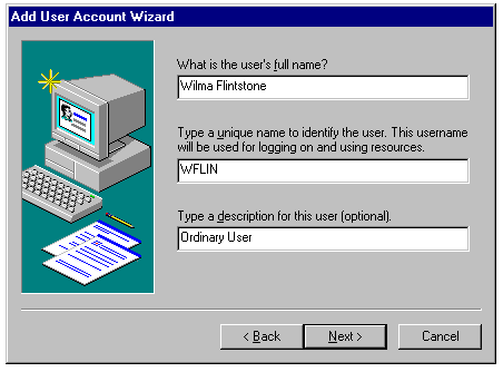 There are several common naming conventions, such as using the first initial of the first name with the last three letters of the last name (for example, Fred Flintstone would have a user name of ffli). Microsoft uses the first name, followed by as many letters of the last name as are required to create an unique user name, which also is used as the employee's Internet e-mail alias (firstlast@microsoft.com). Whatever naming scheme you choose, make sure that it's consistent.