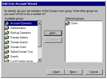 | Account Operators | A restricted account whose members can manage most properties of user accounts and groups. A member of this group can't manage the following Windows NT Server groups: Administrators, Domain Admins, Account Operators, Server Operators, Print Operators, and Backup Operators. Members of this group also can't manage the account of domain administrators and can't alter domain security policies. |